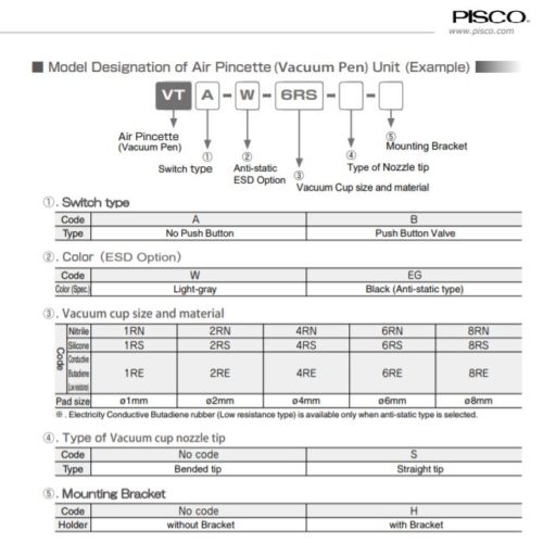 VTA/VTB-W/EG-1/2/4/6/RN RS RE PISCO bút hút chân không được sử dụng để hút các sản phẩm trong công nghiệp. các loại đường kính bao gồm 1, 2, 4, 6, 8 bằng các chất liệu cao su Nitrile rubber, silicone rubber…